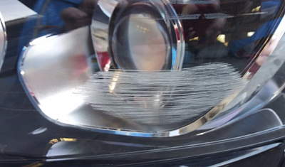 ③フェンダーなどがヘッドライトに巻き込む形状または研磨機が入らない構造の場合、端の処理が甘くなります。レンズ内側の結露跡等は修復していません。